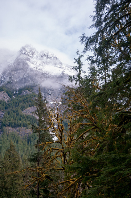 The trail soon climbs away from the river to higher ground with views of Garfield Mountain in the distance. Fresh snow dusted the top and clouds gathered around the cliffs giving it a majestic appearance.